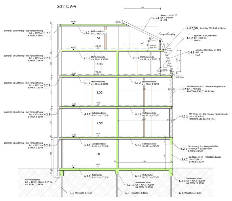 Schnitt bzw. Gründungsplan eines fünfgeschossigen Ersatzneubaus für Betreutes Wohnen mit Bohrpfahlgründung